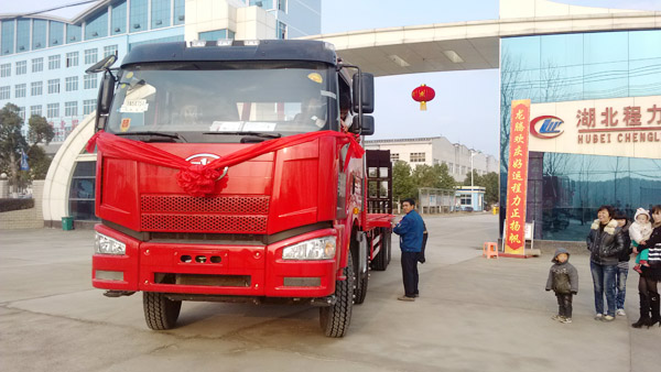 該車于年前客戶定購,于今天昨日交付給客戶,因為在客戶在我公司辦理分期付款業務,在我市上戶,年檢也在我市,客戶對我們說:“其實上我市的牌照還省心些,上客戶當地的牌照年審還要季審,年審,費用也需要3000多,還不如一次性交由我公司來年審,省時省心!”。今天客戶在我市辦理上牌手續及辦理營運證。于晚上客戶提車走。客戶對這輛解放J6前四后八平板運輸車非常滿意。