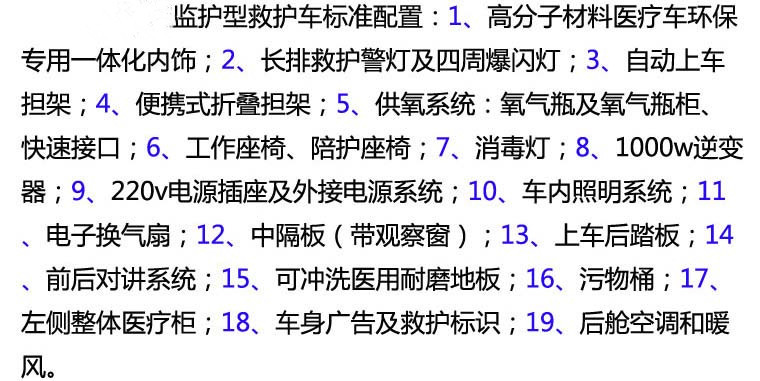 | 其它 | 1.車內(nèi)裝置藥柜、擔(dān)架、氧氣瓶、輸液掛鉤等專用裝置;2.隨底盤選裝中頂時(shí)整車高度為2490mm;隨底盤選裝高頂時(shí)整車高度為2875mm;3.ABS系統(tǒng)控制器型號(hào):APG3550500G;ABS系統(tǒng)控制器生產(chǎn)企業(yè):浙江亞太機(jī)電股份有限公司;發(fā)動(dòng)機(jī)最大凈功率83KW;4.隨底盤選裝后踏步板,對(duì)應(yīng)整車長度為5696mm,不選裝后踏步板時(shí)對(duì)應(yīng)整車長度為5496mm;隨底盤選裝輪罩蓋,選裝前霧燈,選裝黑色前大燈;6.車身可選裝爆閃燈.車頂可選裝圓柱形爆閃燈. | ||